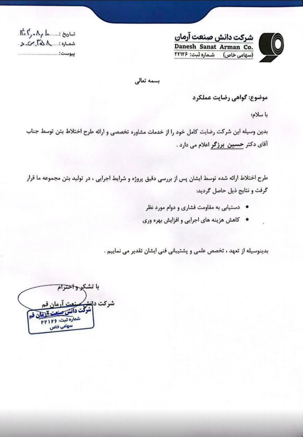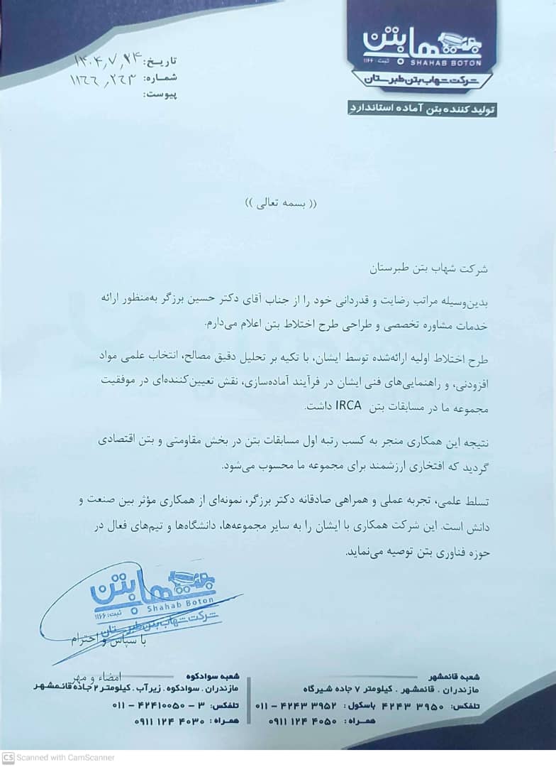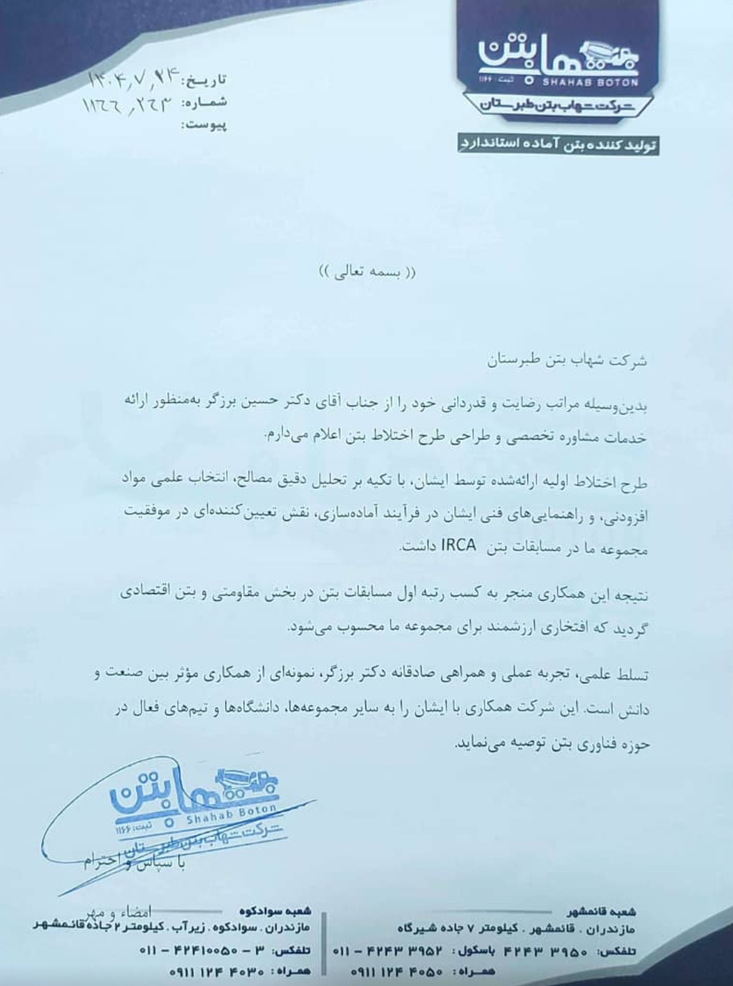 رضایت نامه کارخانه بتن آماده شهاب بتن طبرستان - مسابقات بتن کشور